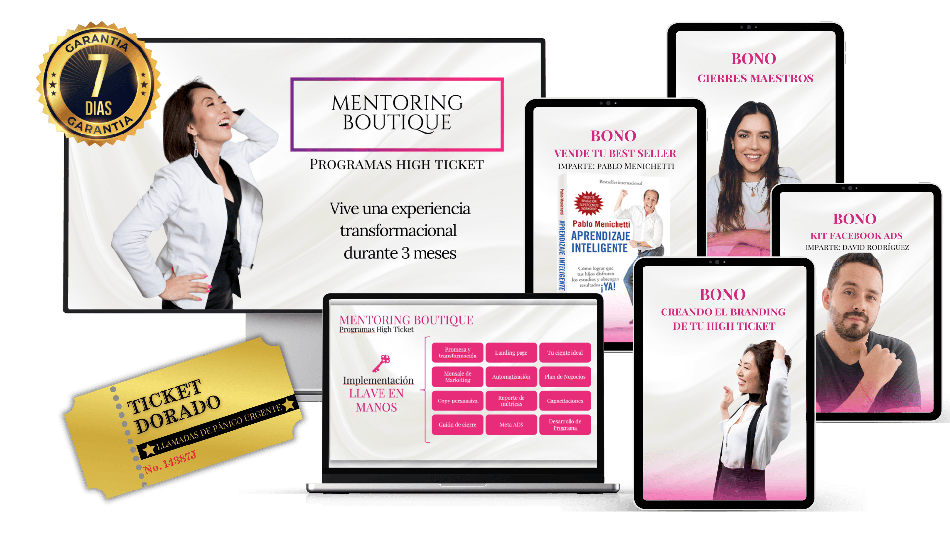 Trabajas de la mano con 2 mentores y un equipo experto con 14 años de experiencia en negocios de coaching para crear Tu Programa Best Seller High Ticket que te posicione como líder en tu nicho, y crear un negocio automatizado y que genere ingresos recurrentes para que puedas enfocar tu tiempo en lo que realmente importa: